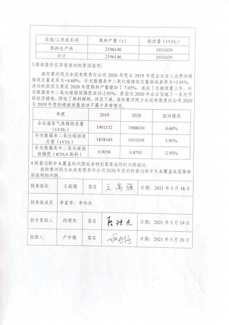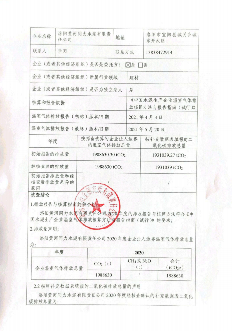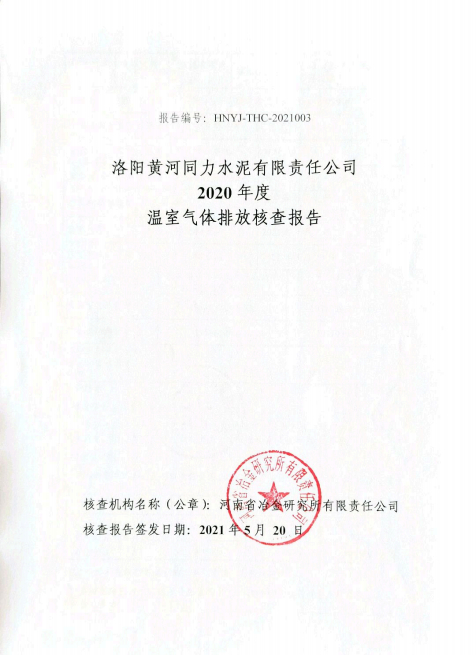洛陽(yáng)黃河同力水泥有限責任公司2020年度溫室氣體排放核查報告